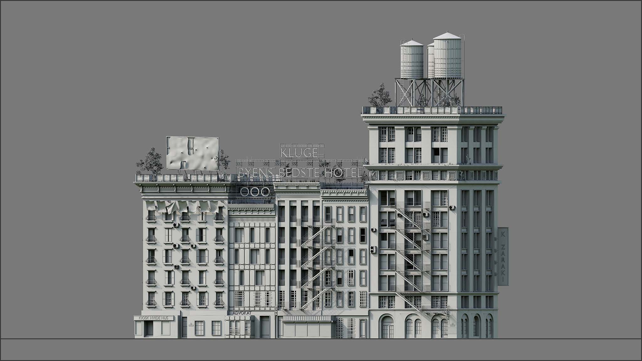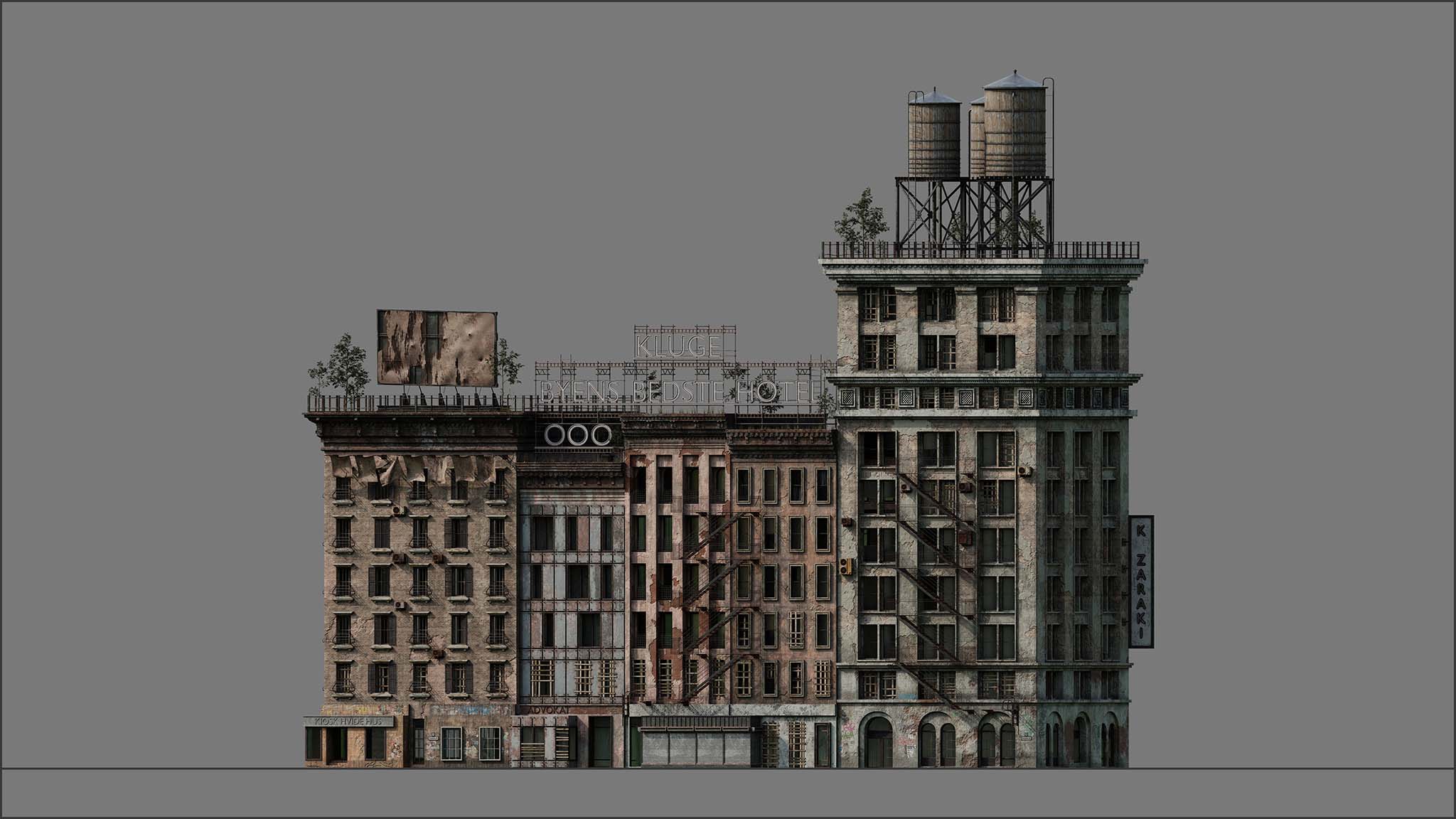 all models and assets were created from scratch. the process began with a full blockout to plan the multi-level flow, defensive logic, and urban composition. textures were hand-painted, final render were adjusted in photoshop
