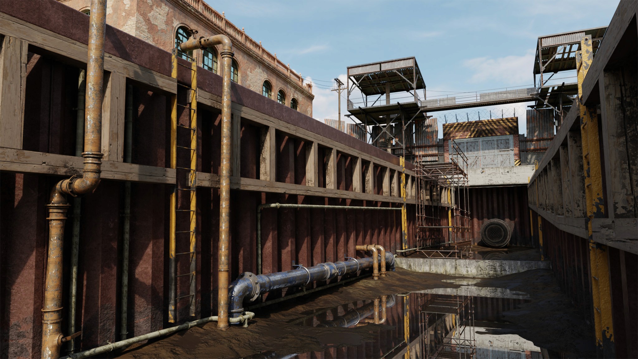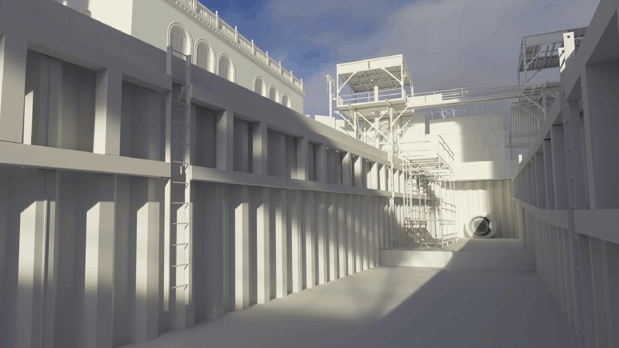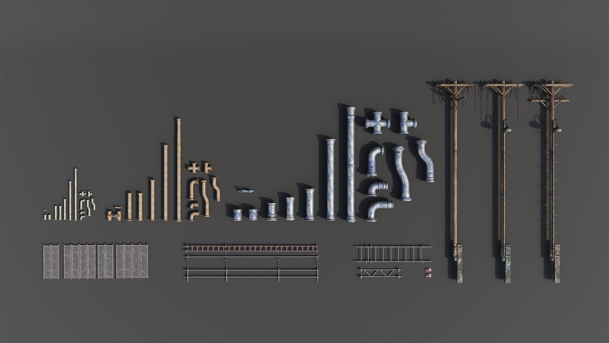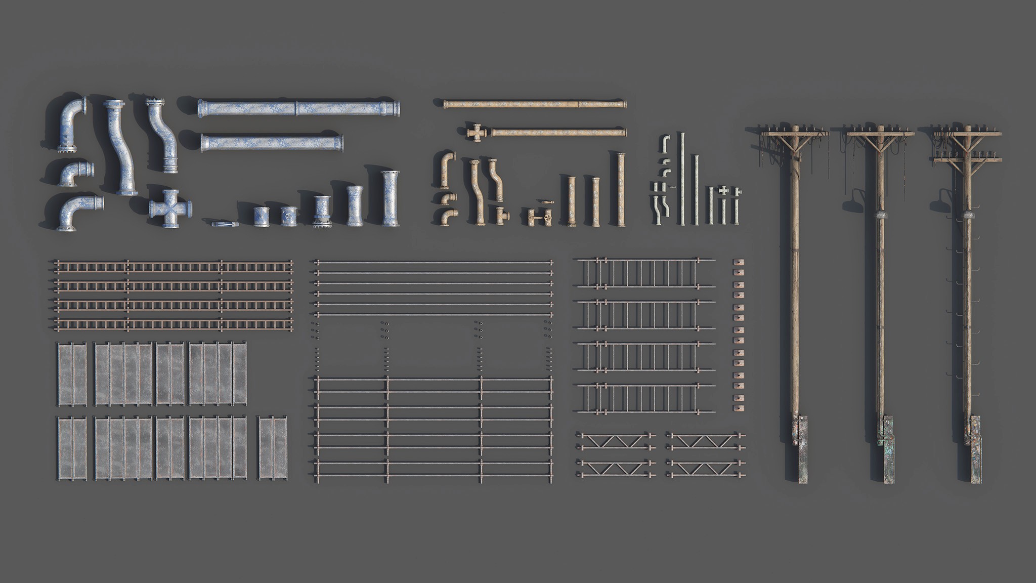develop modular reusable and re-adjustable assets such as ladders, pipes, electrical pillars, metal construstion details, wires