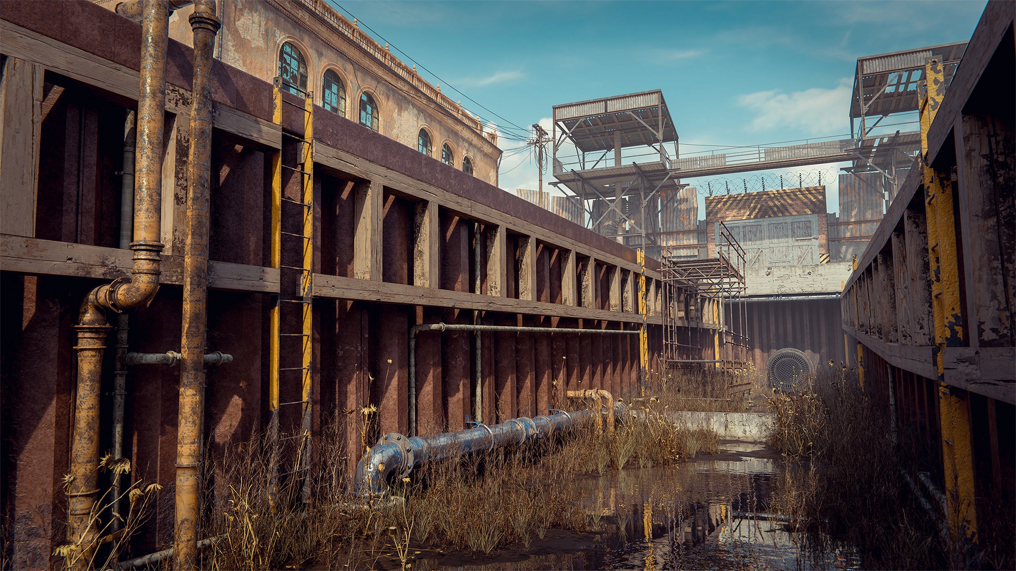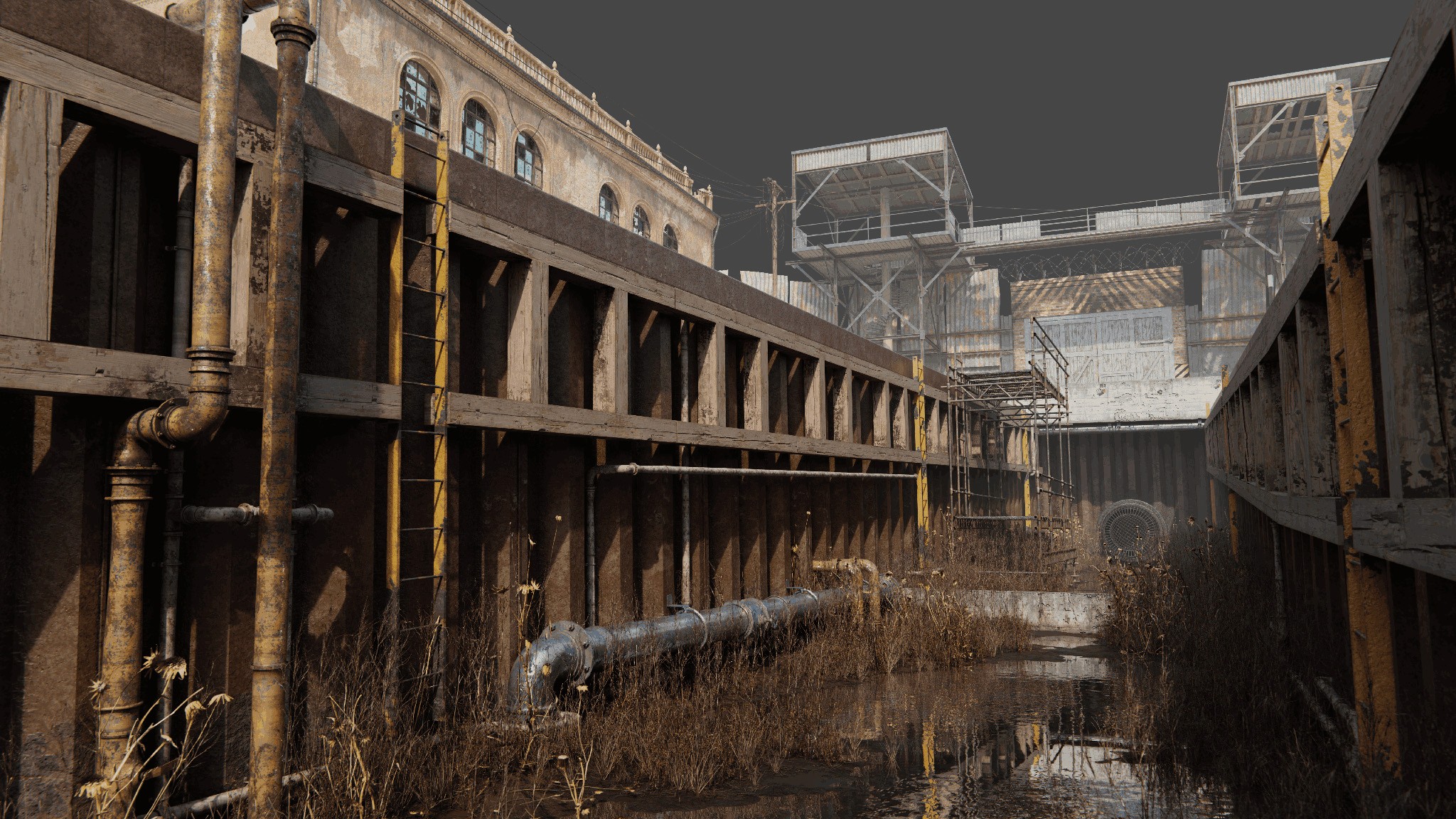 parasite depicts a world after a zombie apocalypse, where the last survivors have taken refuge in the city center, turning it into an isolated zone. city canal is a crucial part of this enclave, showcasing how long ago the disaster happened and how difficult it has become to obtain essential resources like water, food, building materials etc.