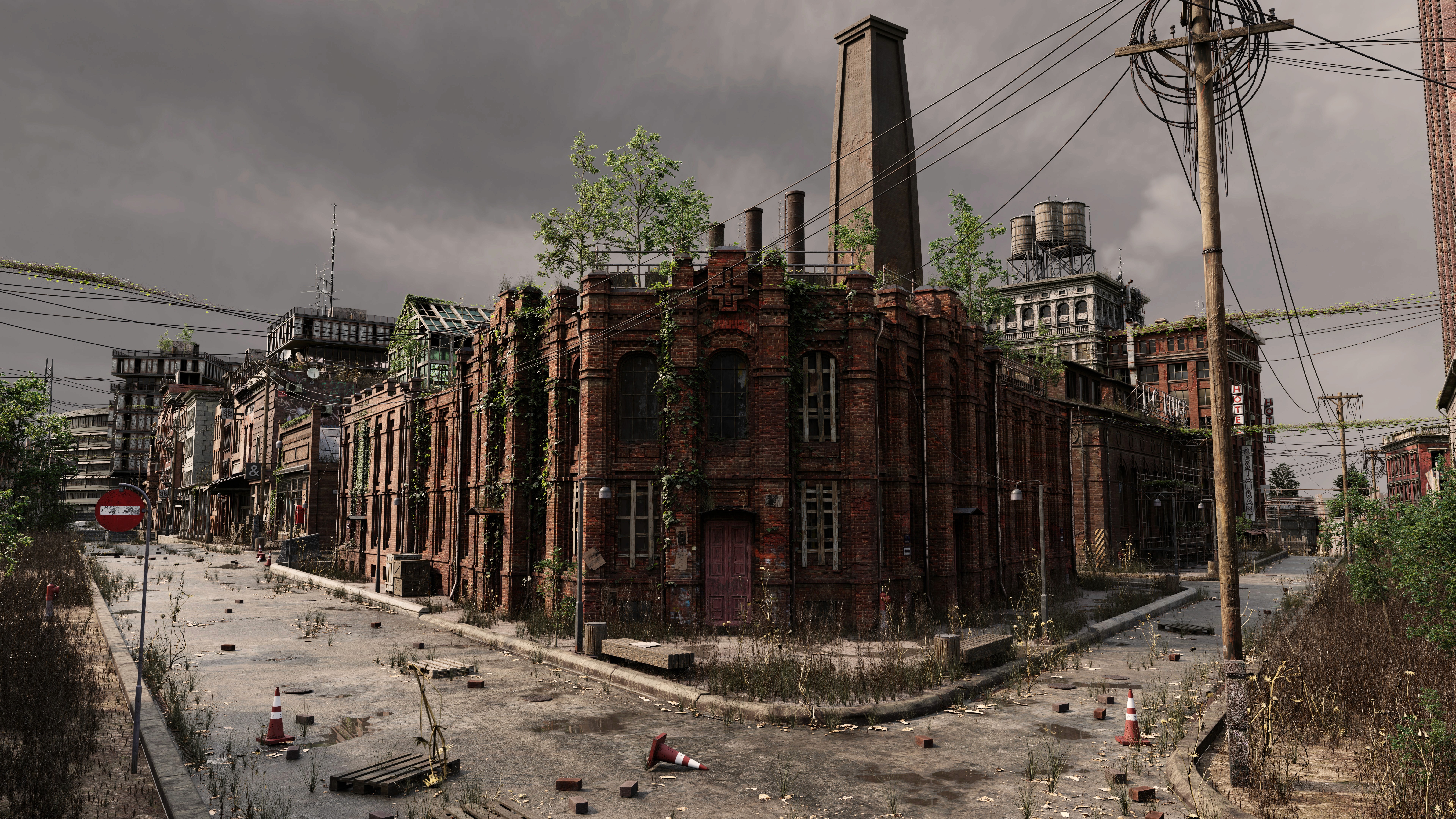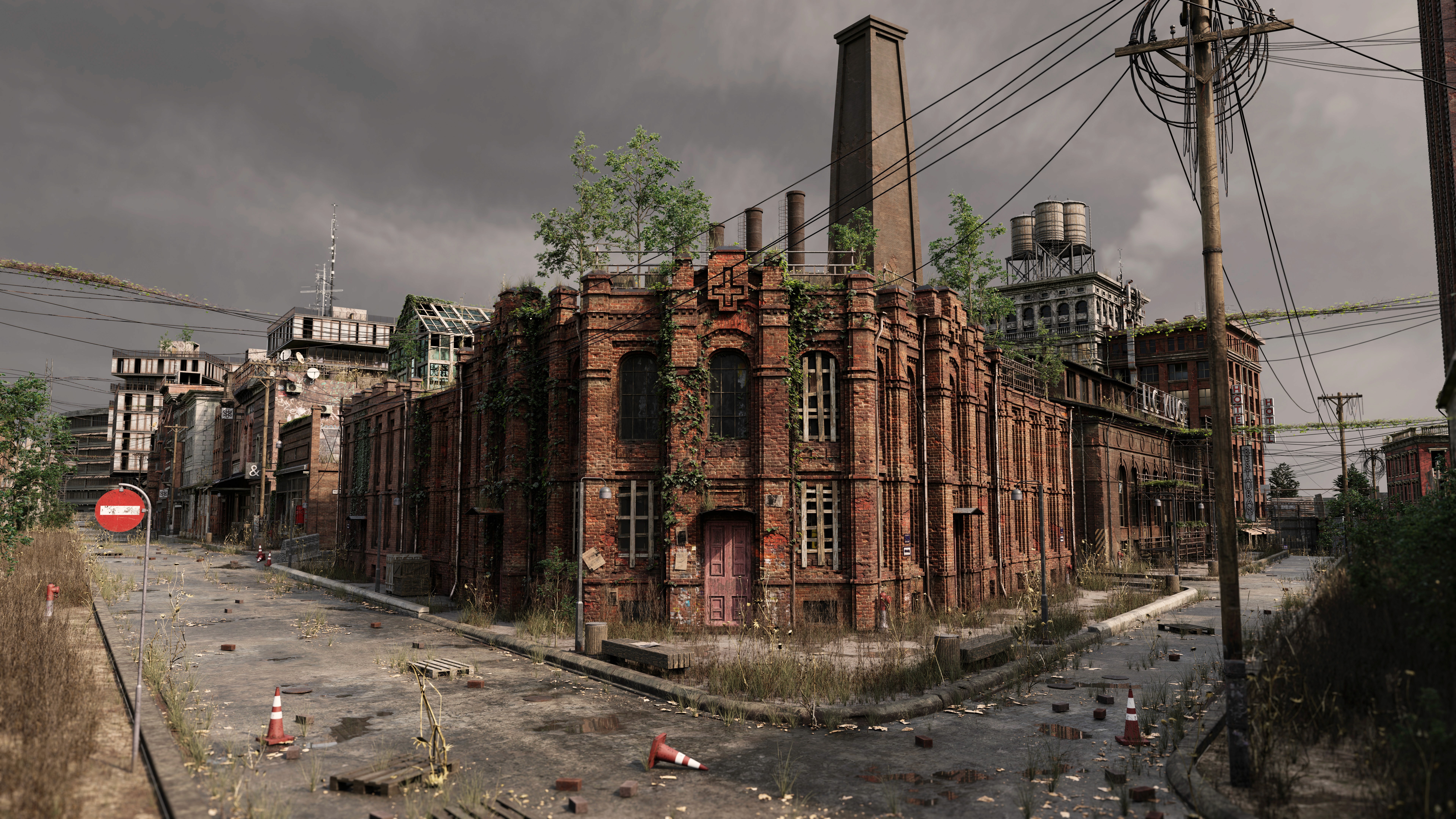 This new scene brings together elements from several previous locations: checkpoint zones, perimeter streets, industrial facilities, and rooftops now overtaken by nature.