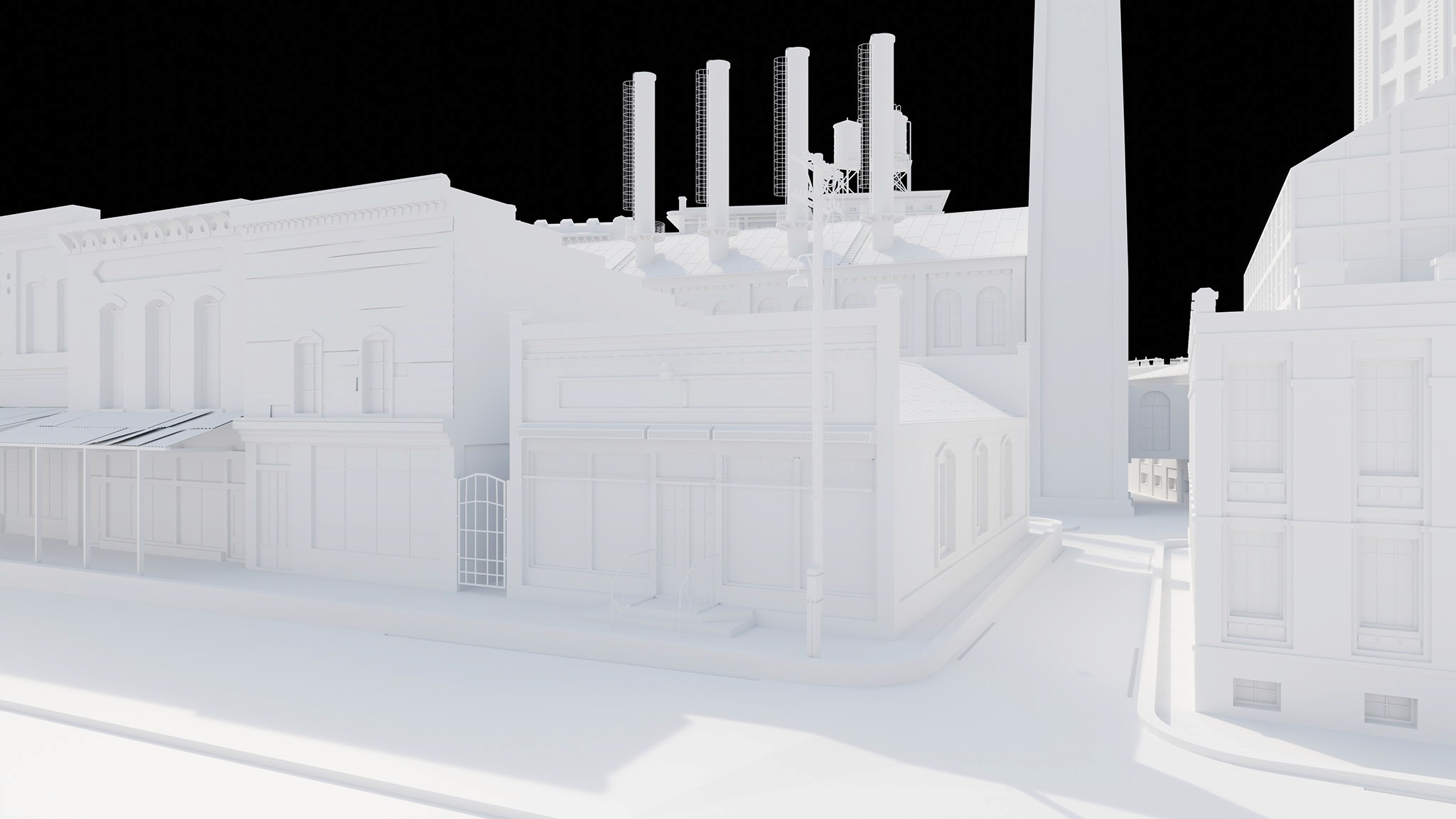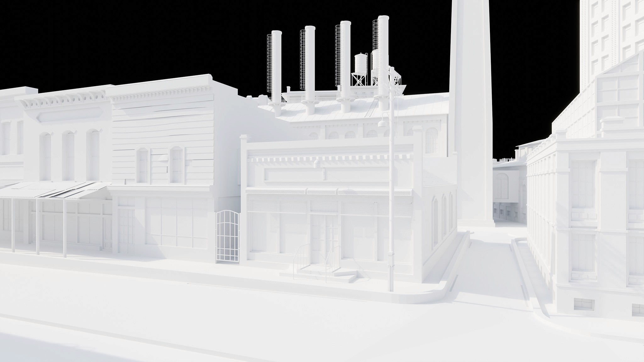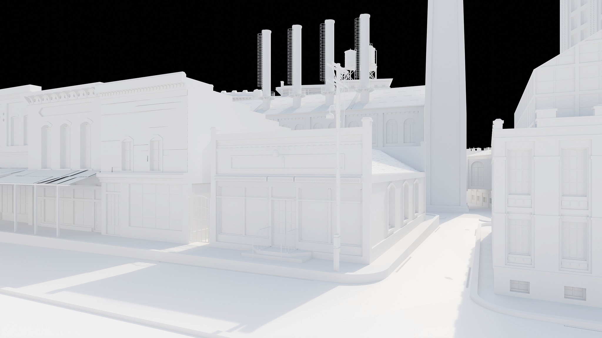 maintain lighting and atmospheric systems, reuse existing material libraries and 3d assets, bring attention to the front facades of the grocery shops in the front