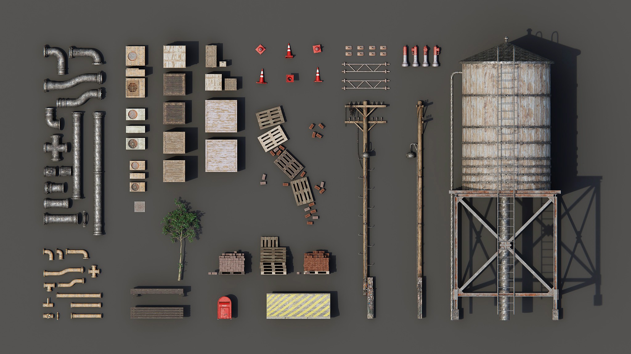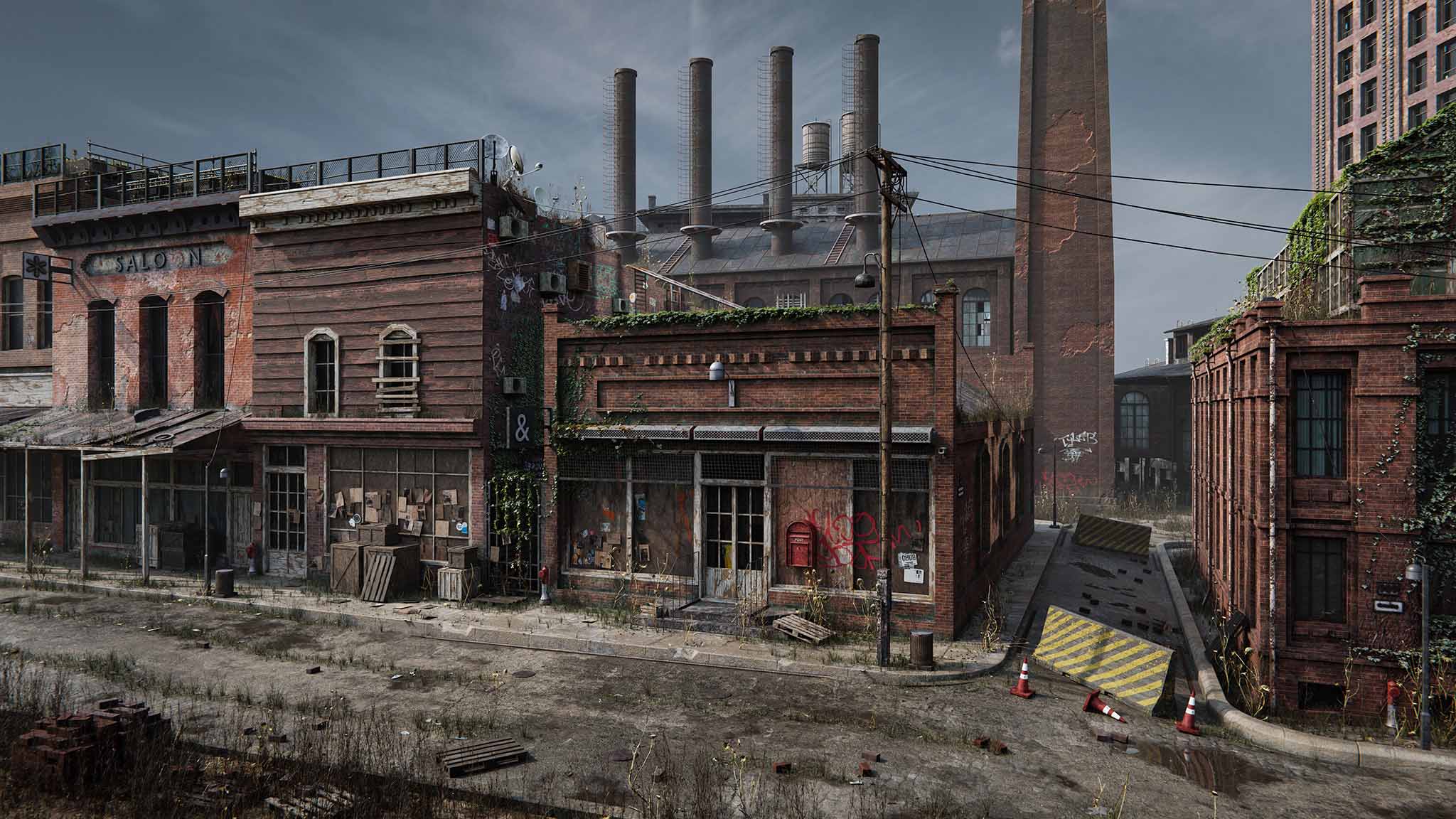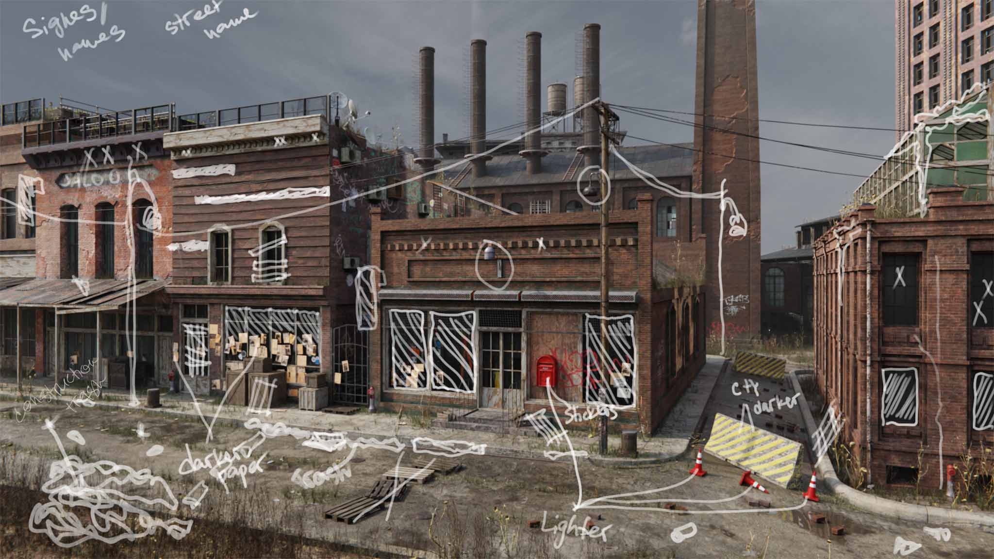 use limited amount of 3d assets to create and find balance between leaving street and factory on a background