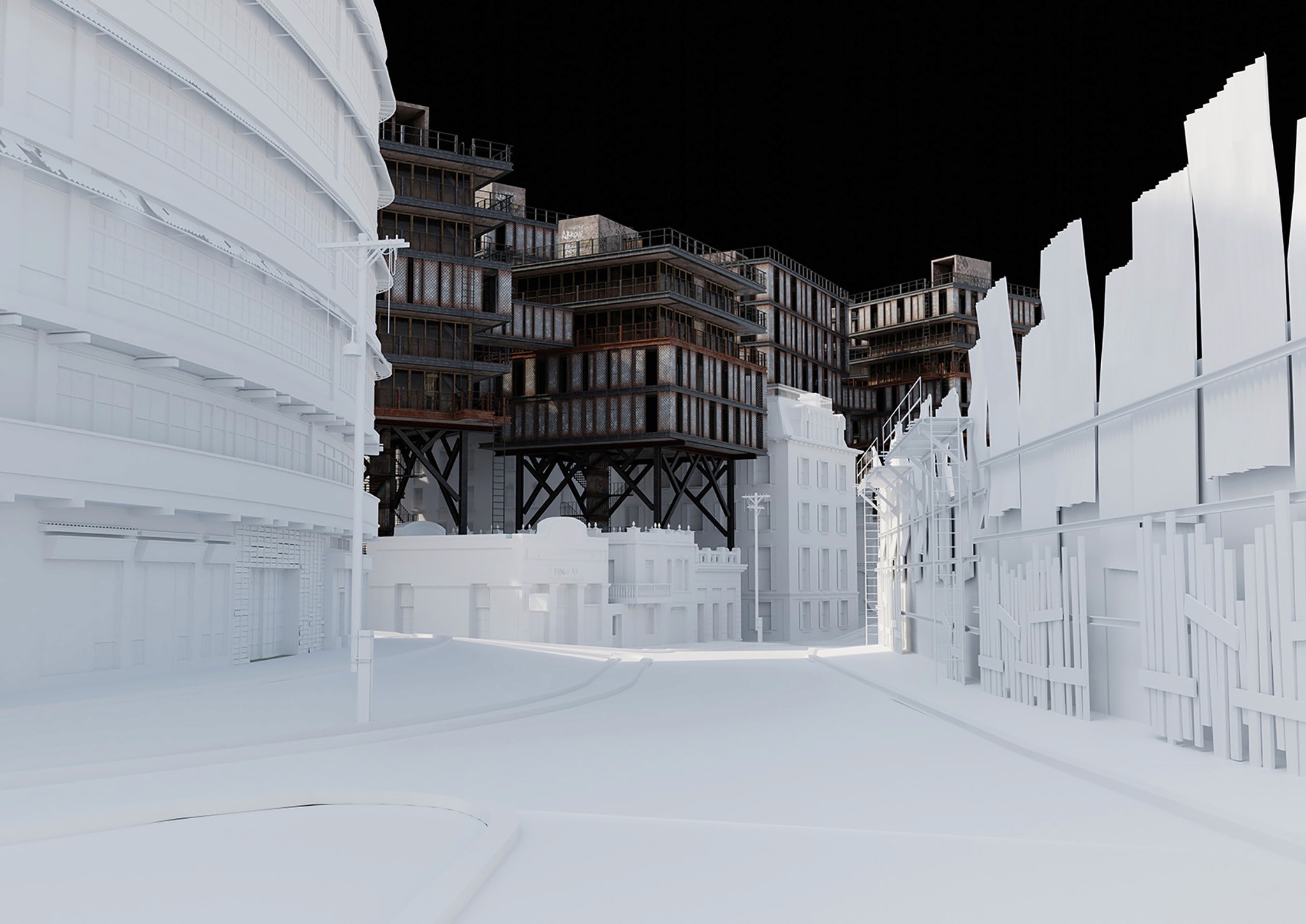 this piece explores the architectural and social structure of a parasitic micro district - an autonomous, elevated system built within the decaying heart of a once-thriving city. designed as a layered defense against the hostile outside world, this enclave represents a dystopian form of survivalist urbanism