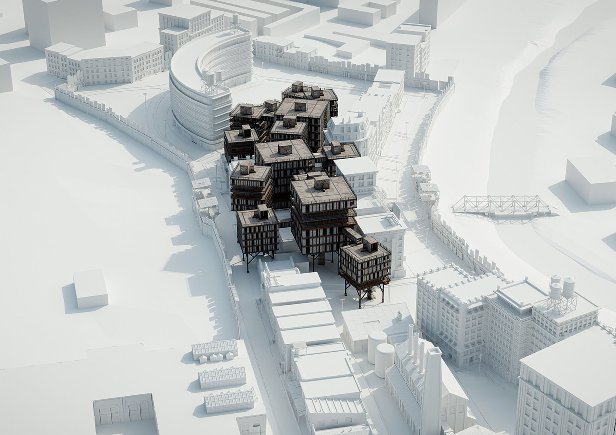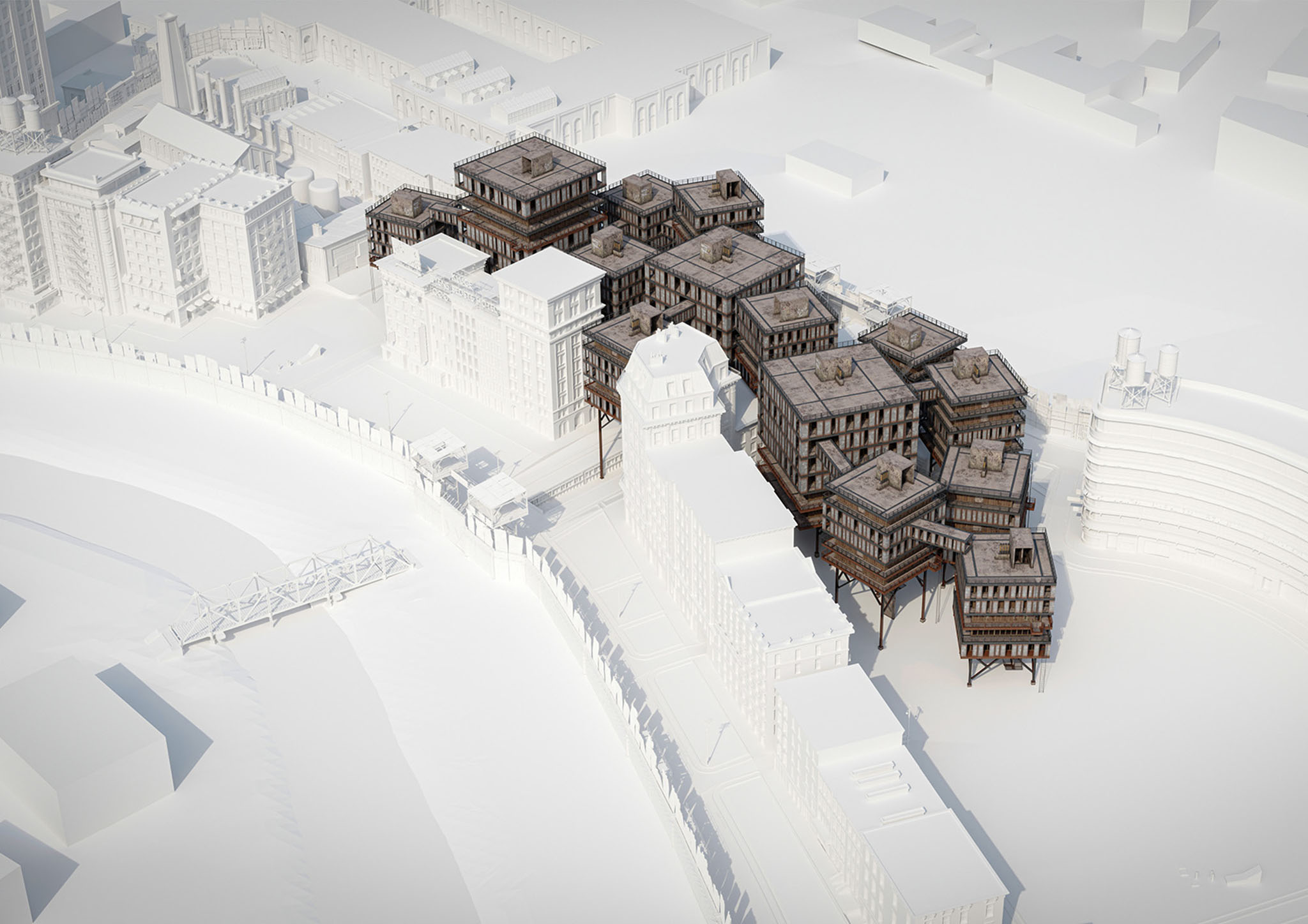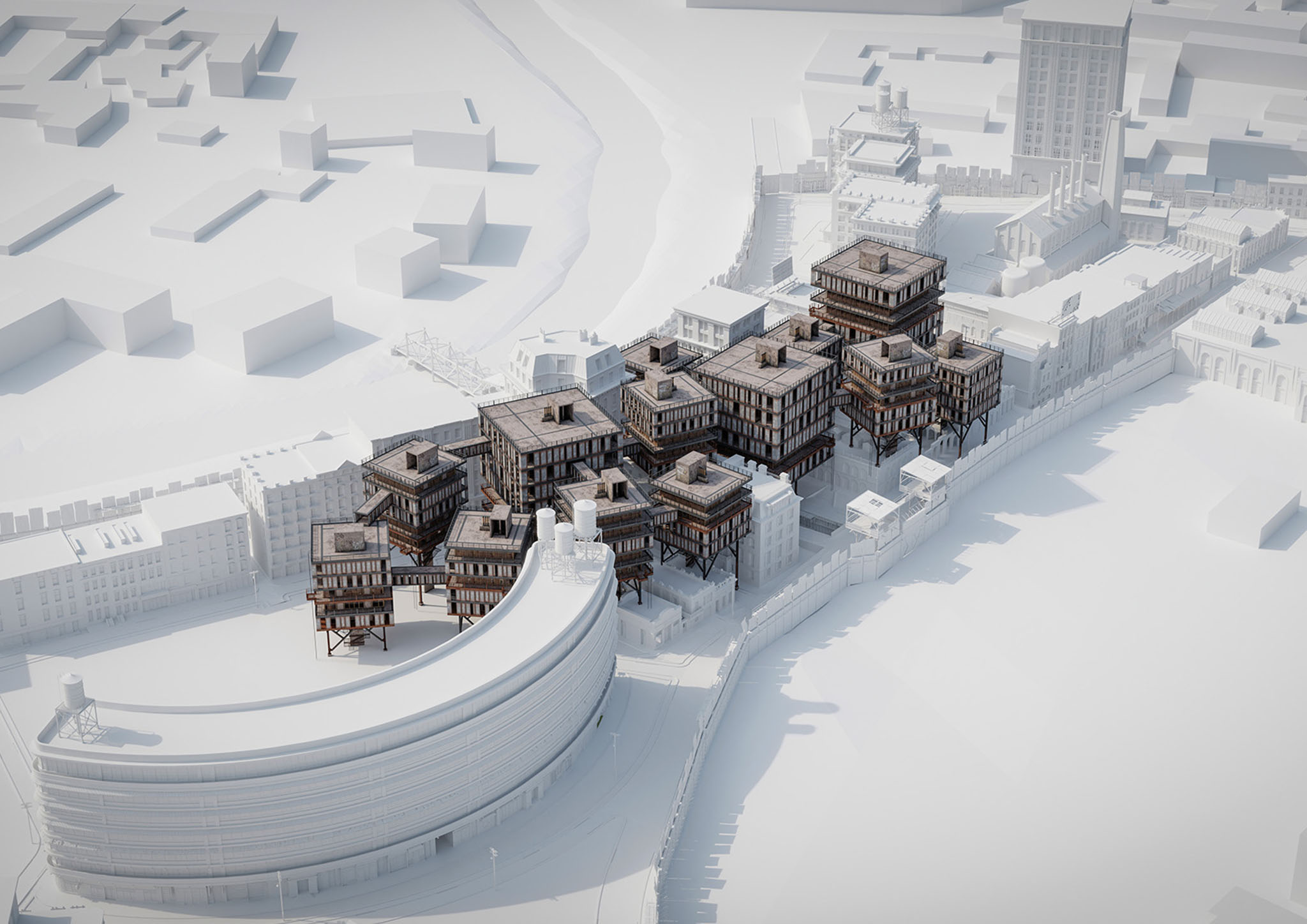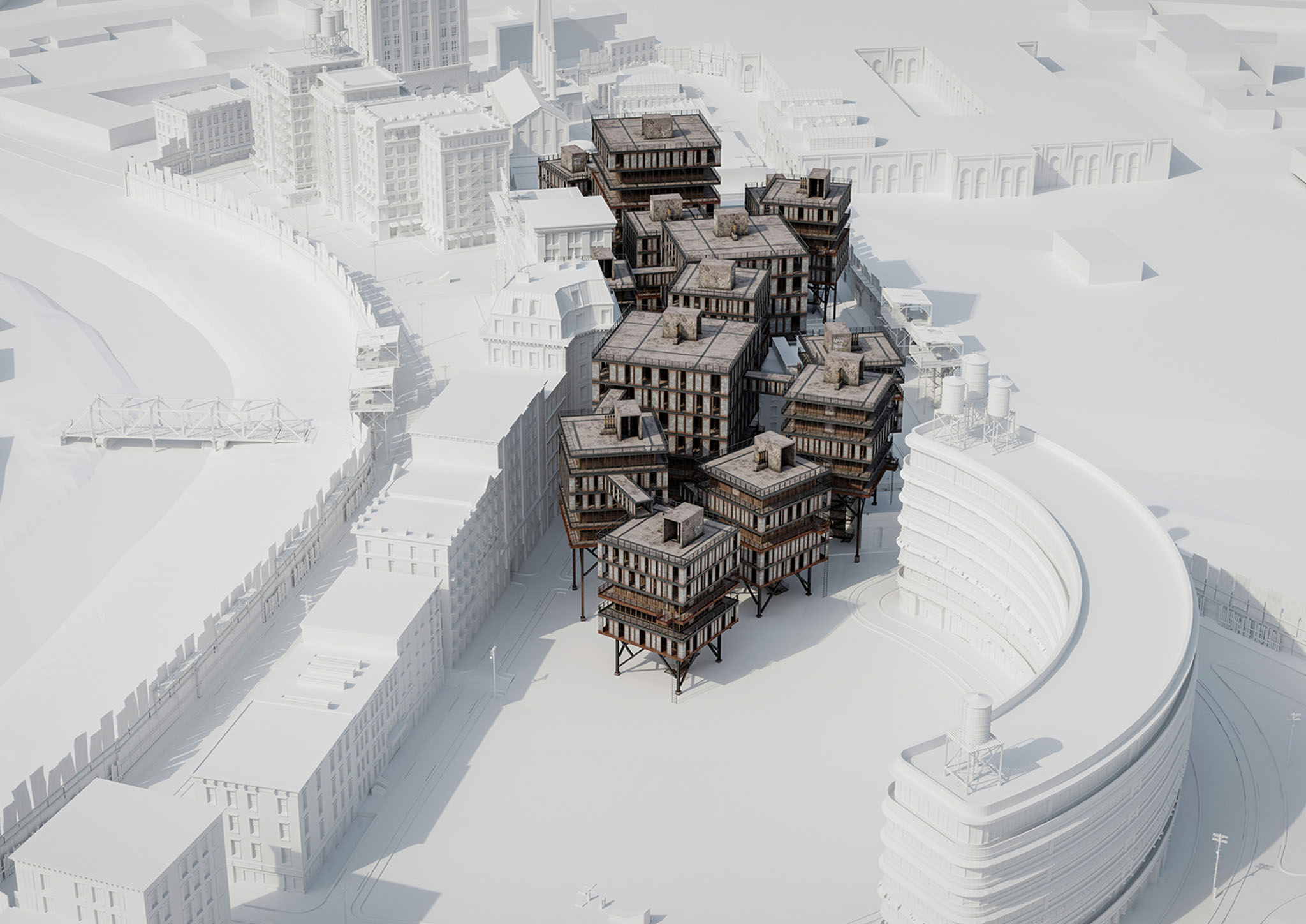 inspired by parasitic architecture, these elevated homes plug into the existing city without replacing it. instead, they supplement and reanimate the ruins, bridging function and symbolism. the free-form layout allows flexible distribution across urban or even difficult terrain (e.g., clay or hilly ground), thanks to their rod foundation.