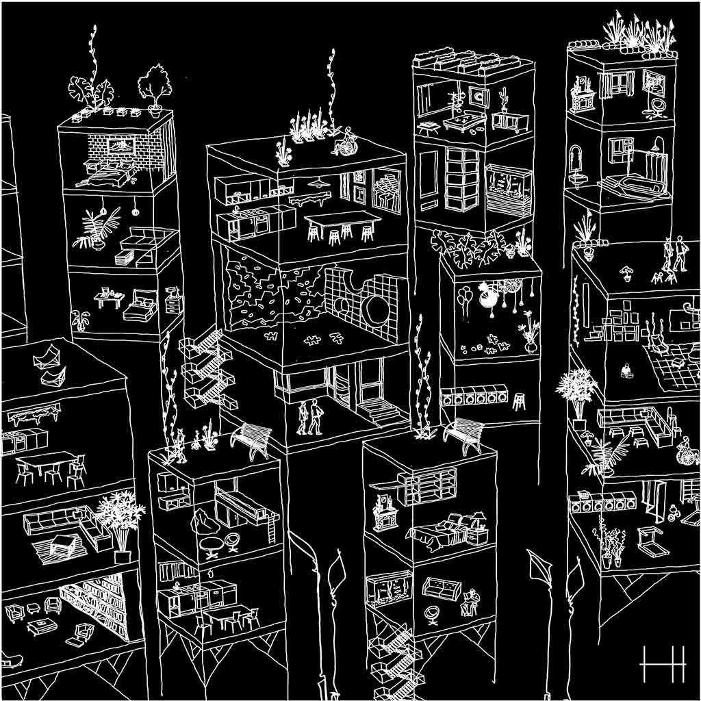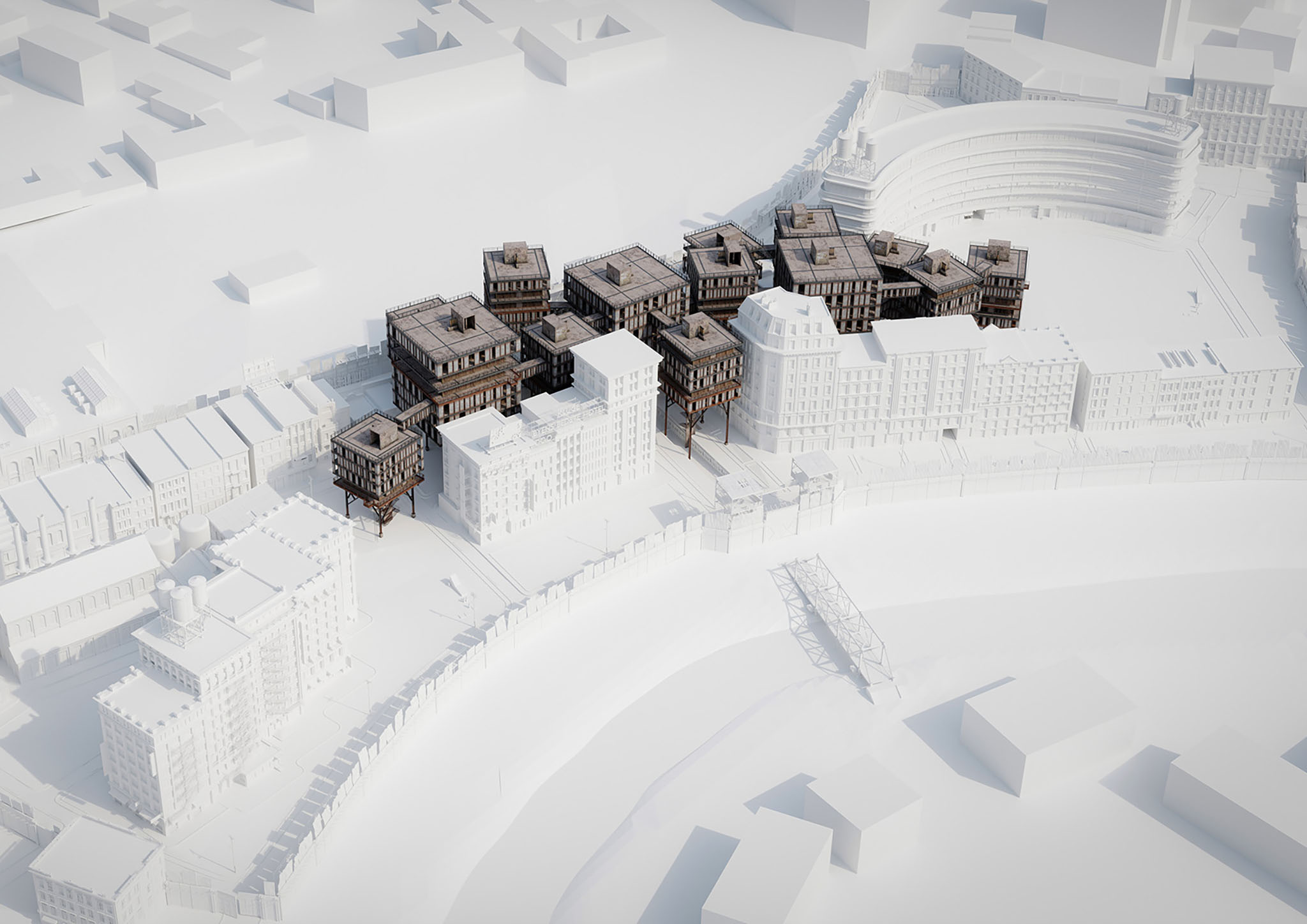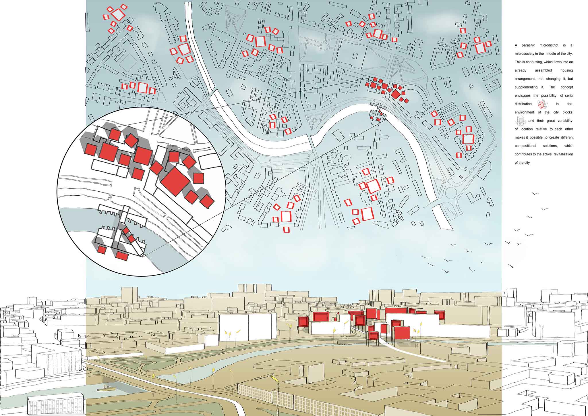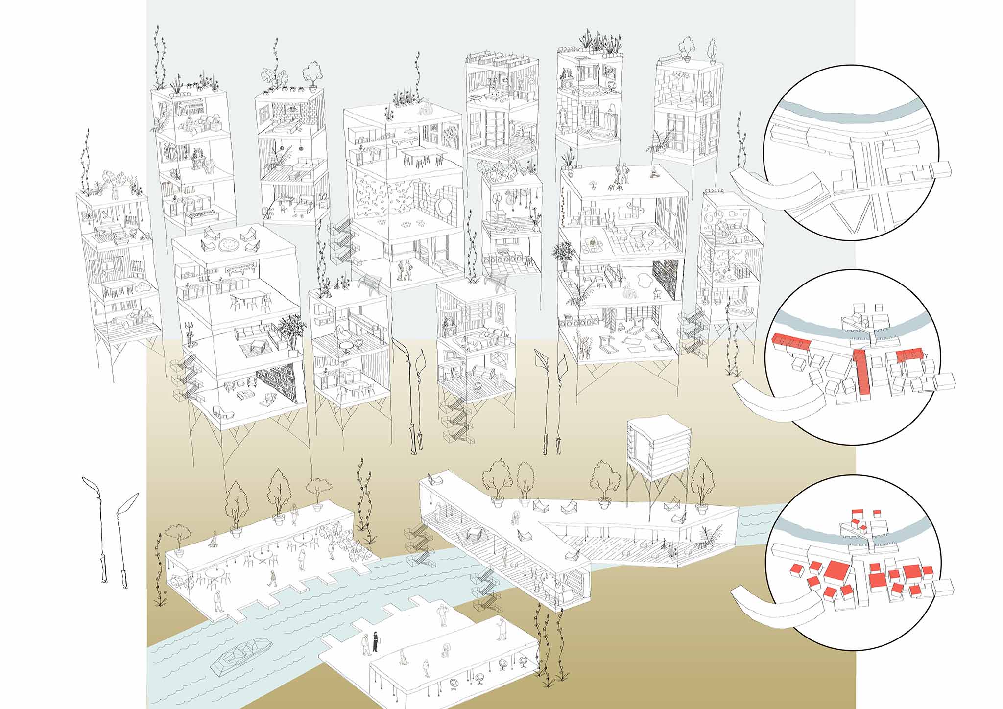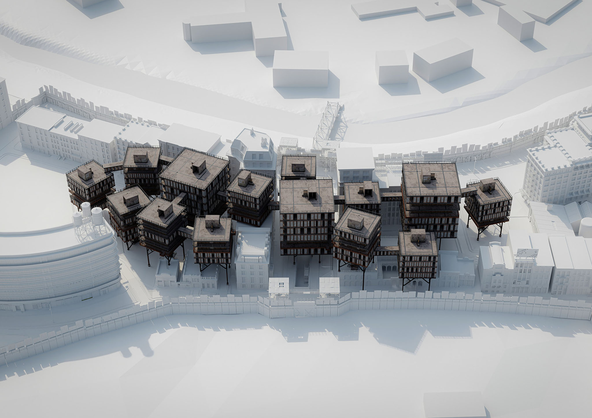 inspired by parasitic architecture, these elevated homes plug into the existing city without replacing it. instead, they supplement and reanimate the ruins, bridging function and symbolism. the free-form layout allows flexible distribution across urban or even difficult terrain (e.g., clay or hilly ground), thanks to their rod foundation.