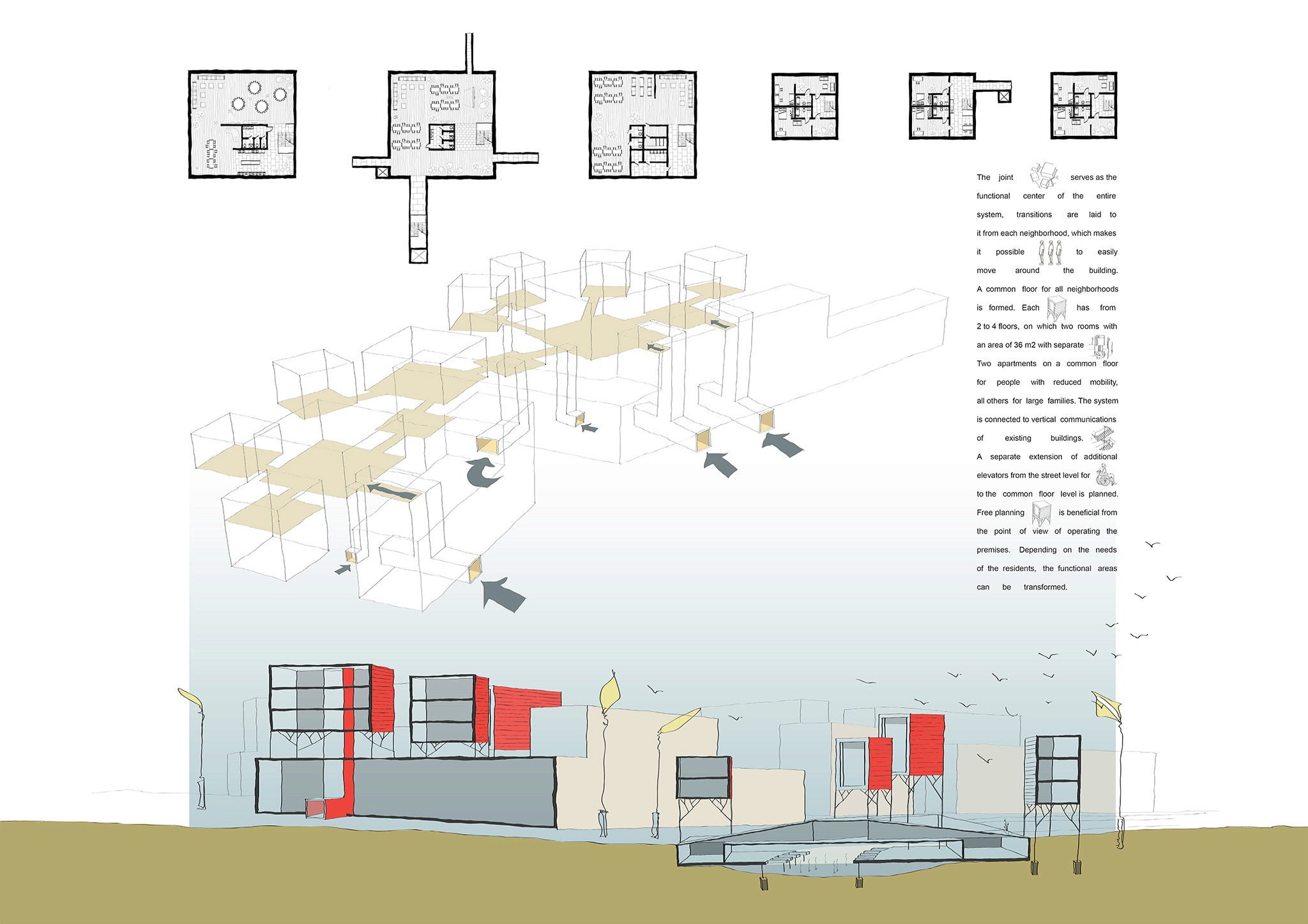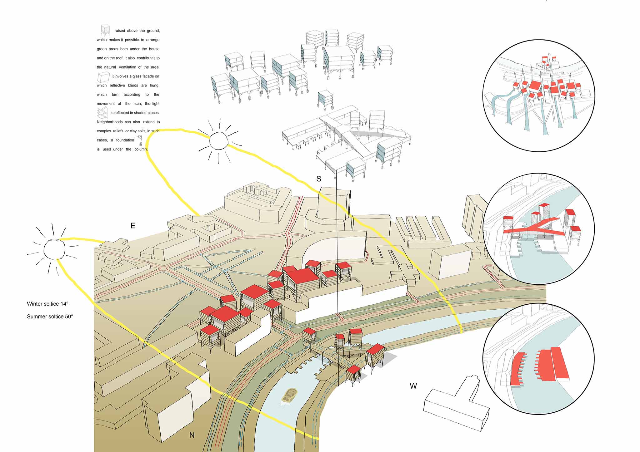 green areas grow both on rooftops and under the stilts. glass facades adapt to the sun’s position, casting light into shaded areas and enabling thermal control. shared infrastructure like elevators, sewers, and ventilation is integrated with existing buildings. accessibility features include additional elevators for those with reduced mobility.