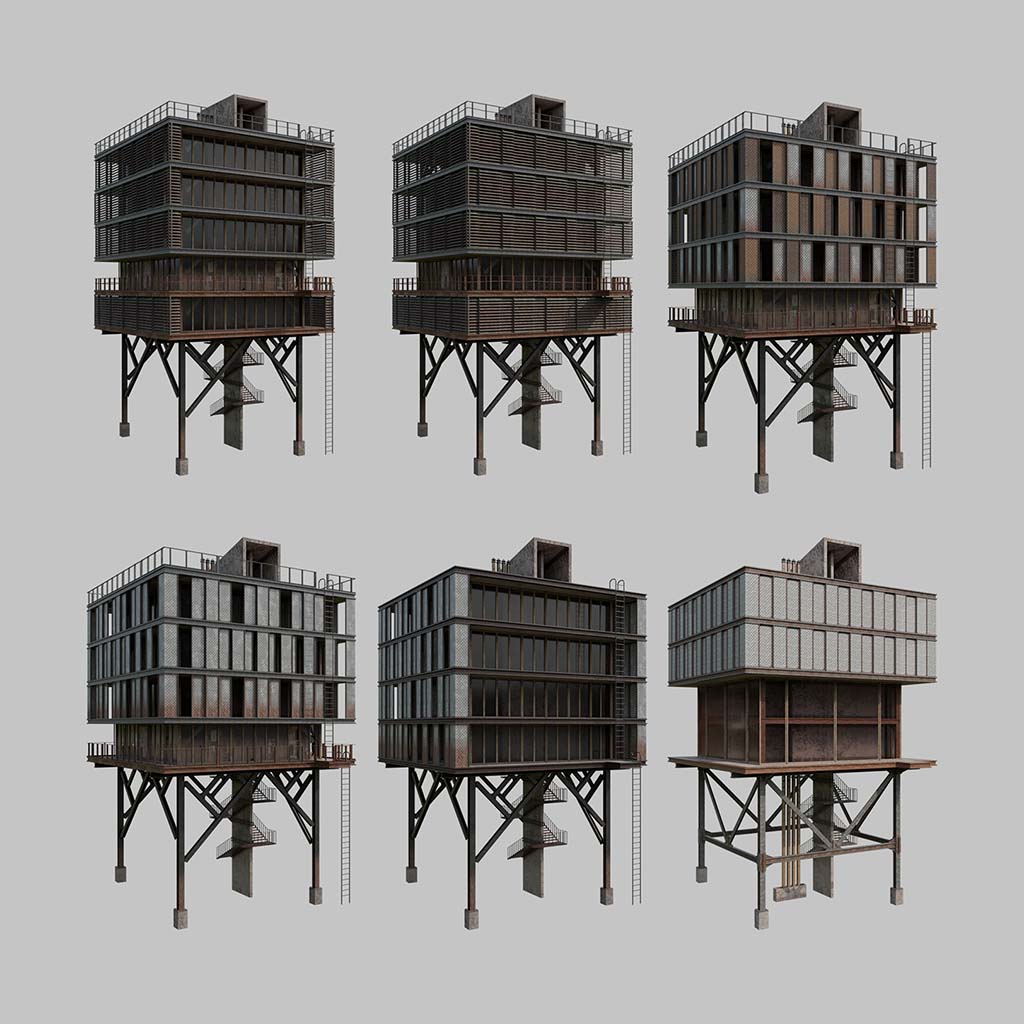 this self-sufficient district is protected by multiple perimeters: an external fence, a buffer zone of semi-abandoned lower buildings, and the upper level of buildings - elevated residential units standing on structural pillars. these tower-like modules form the upper layer of society, both literally and socially. each building hosts 4–6 floors, two-six families per floor, with rooftop paths allowing secure movement between units. beneath them lies a old city, filled with distrust and resentment toward the privileged class above