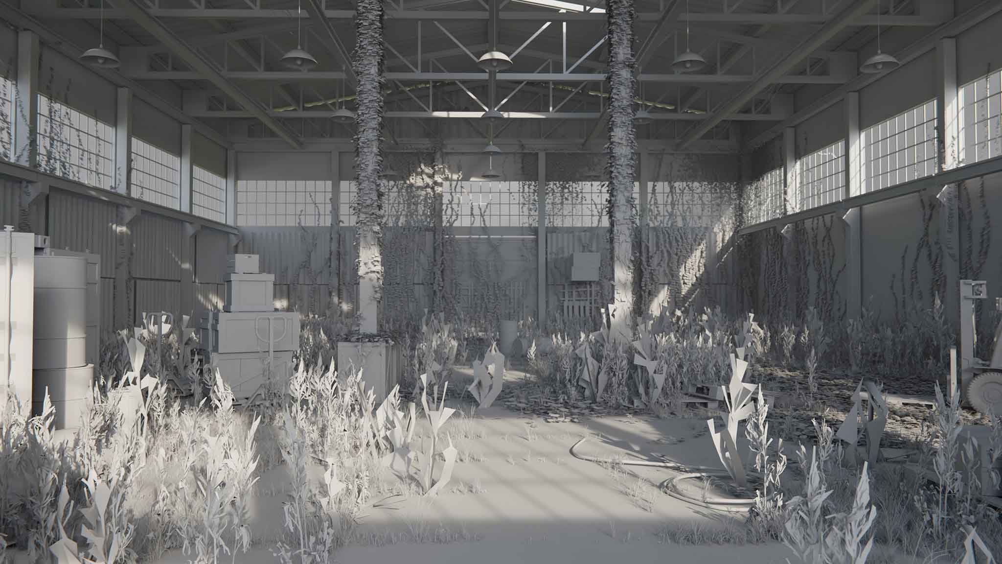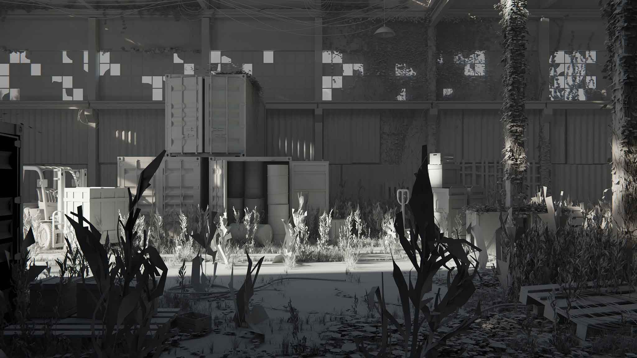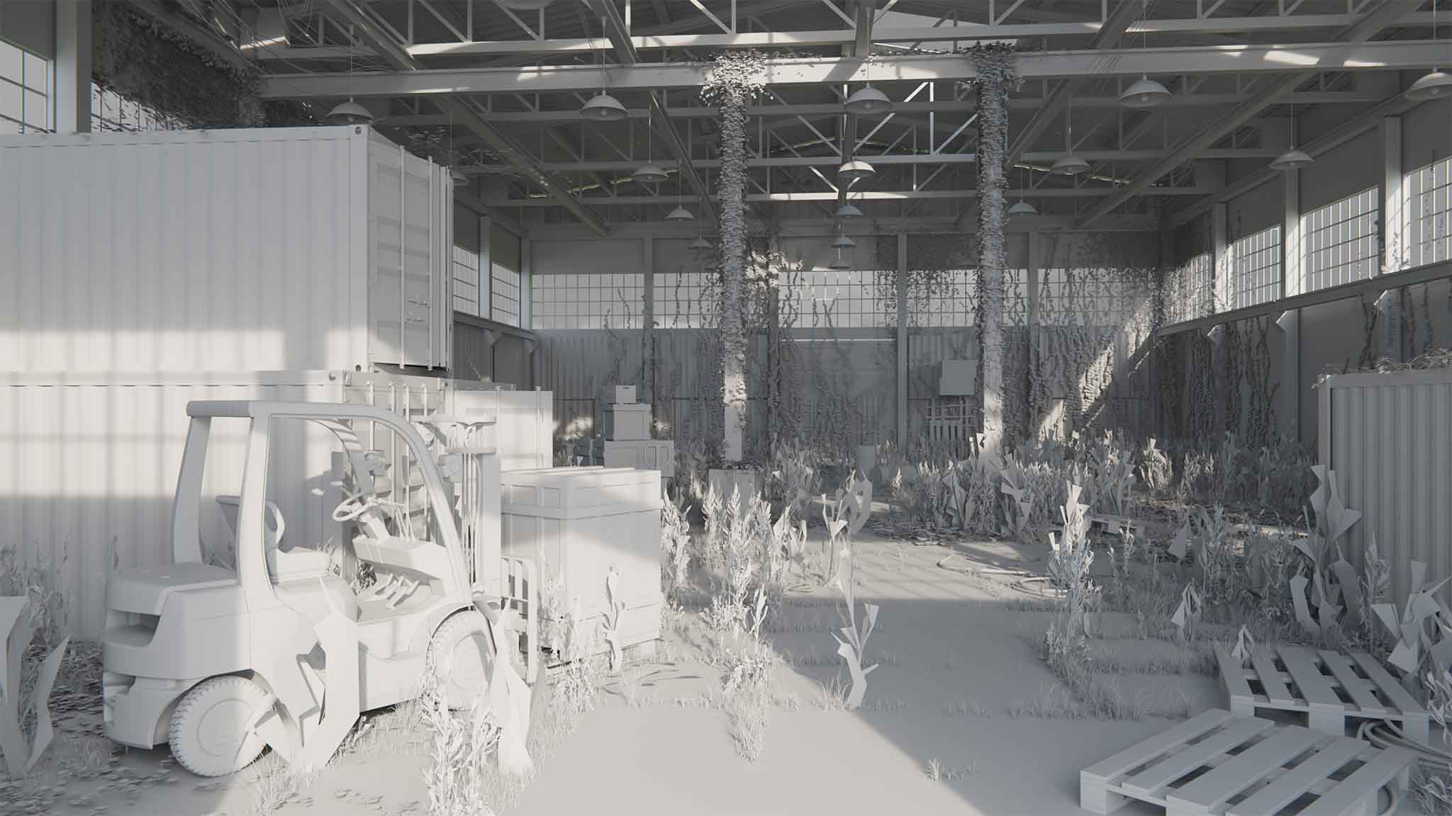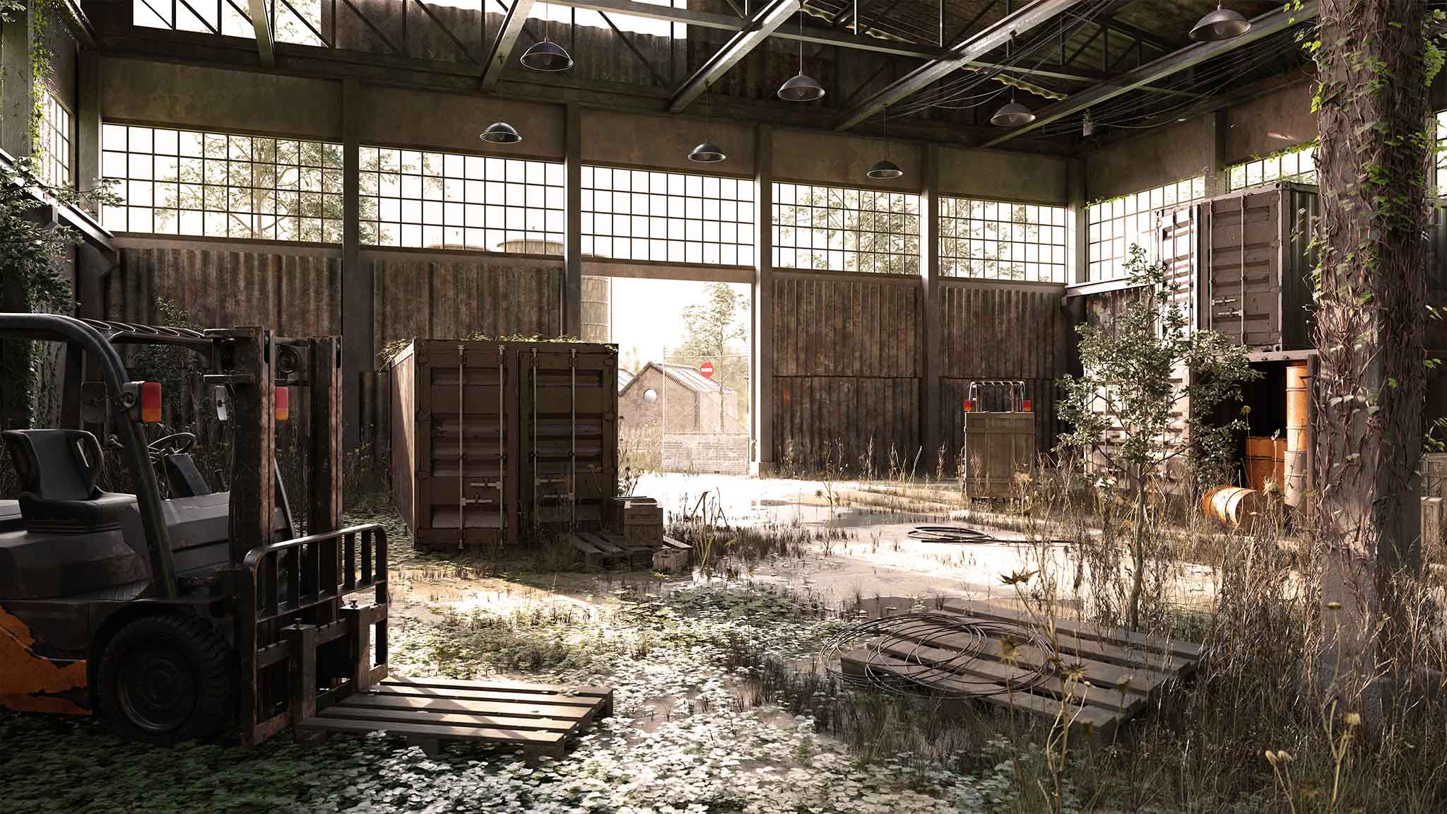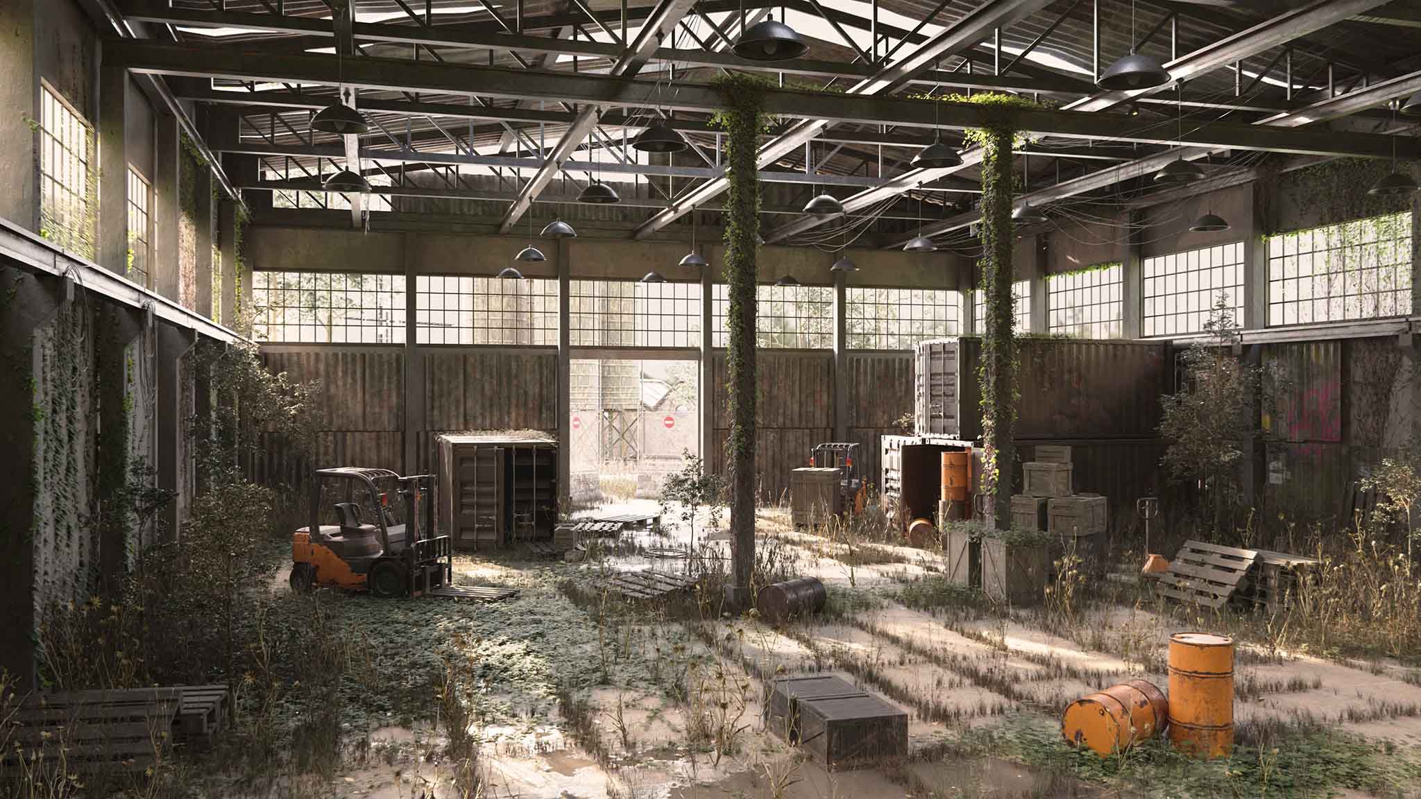 the scene captures a forgotten warehouse, once used for transport and storage, now overtaken by time, nature, and silence.