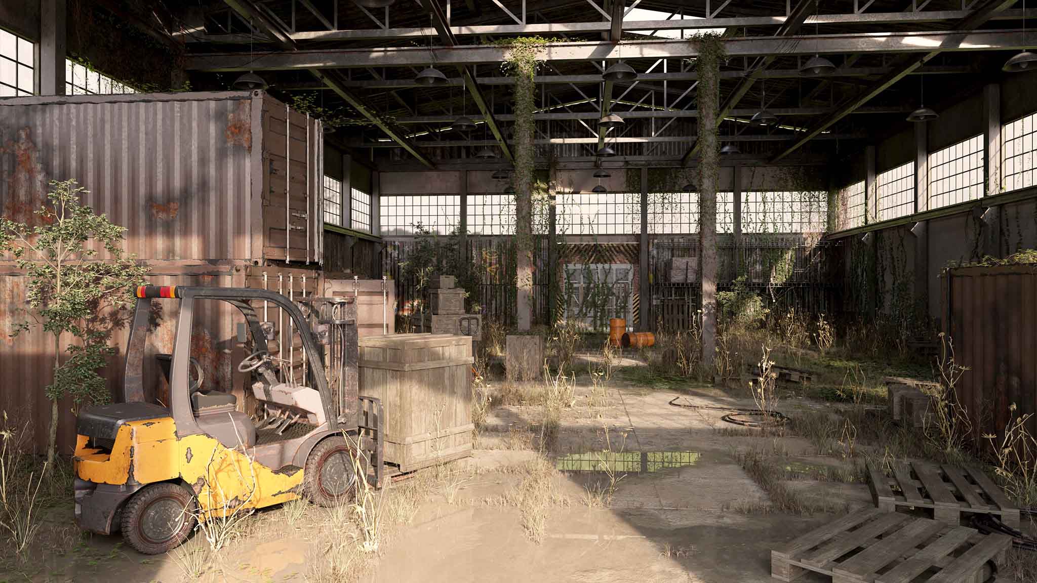 crates, containers, and barrels remain scattered, untouched, rusted, and partially consumed by overgrowth. puddles reflect light from shattered windows above, while vines creep down the support pillars. in the shadows, old industrial machinery still lingers a forklift and hand pallet truck left behind, telling the story of a sudden stop and a world that moved on.