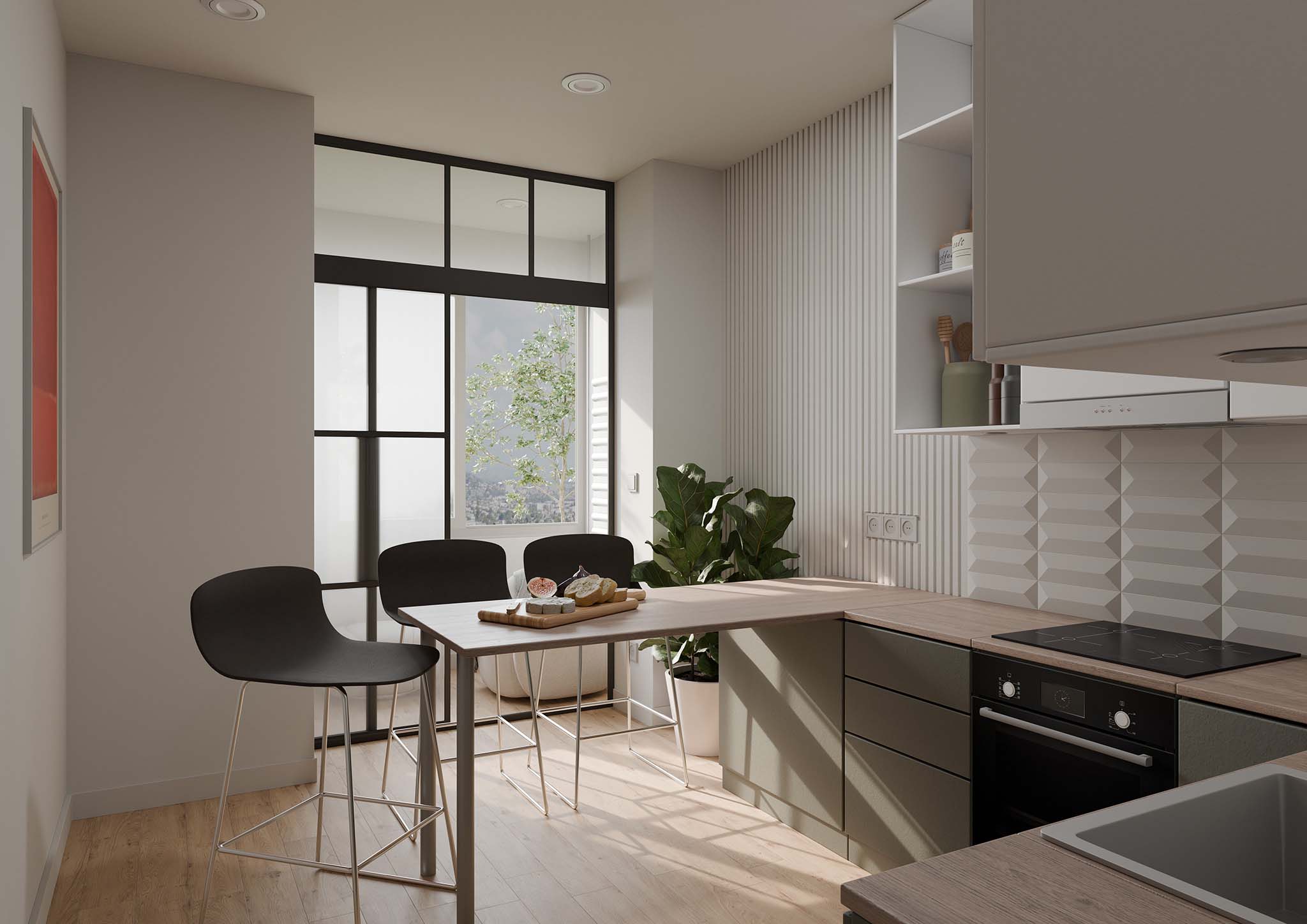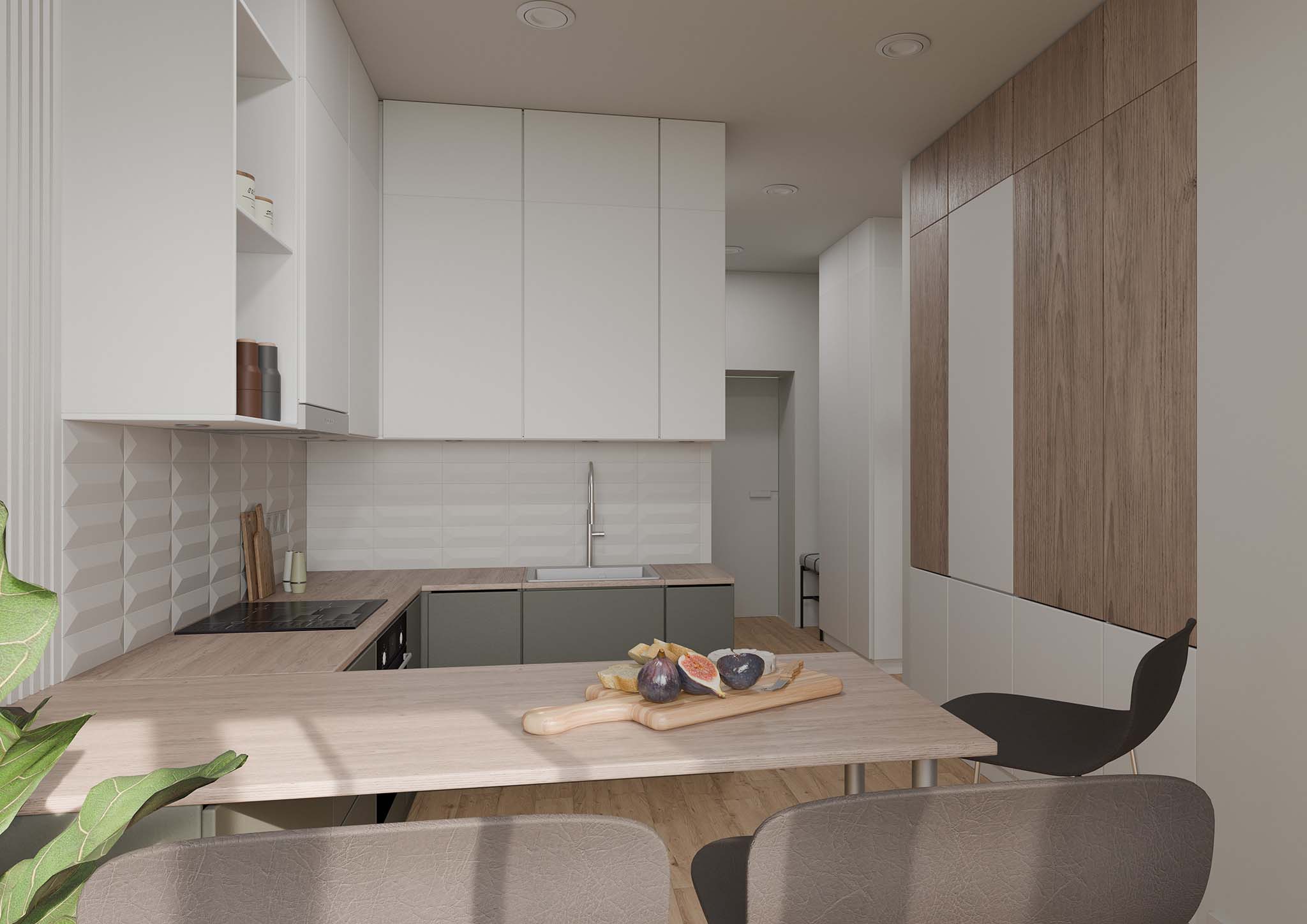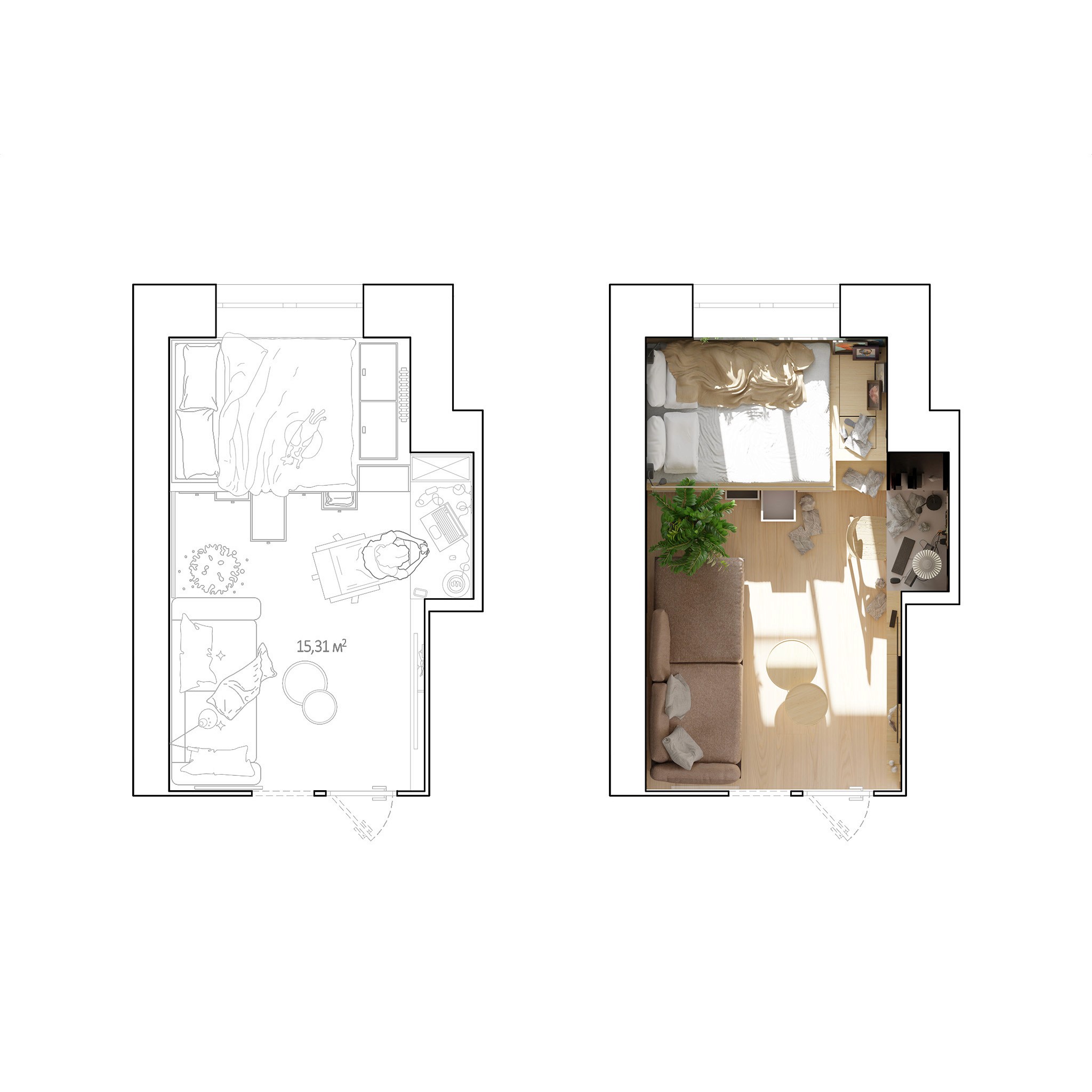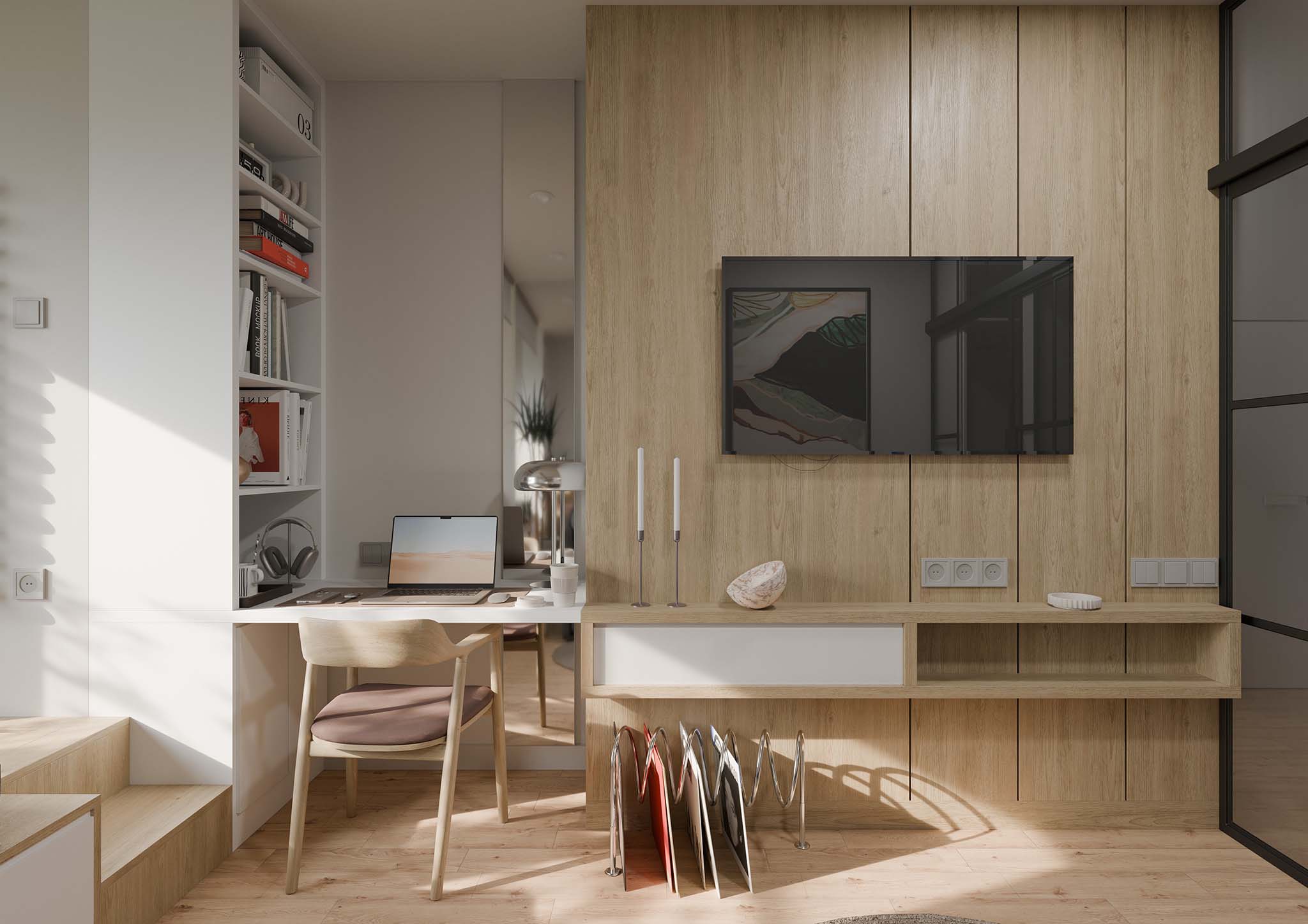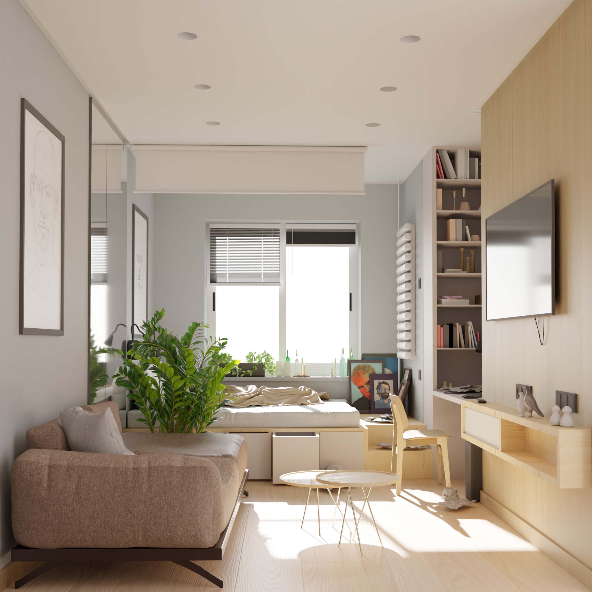 the goal was to create an open, light-filled space with easy access to windows. the bedroom area can be separated with a screen, allowing for a more private sleeping zone or a cozy movie setting. in the kitchen, glass doors lead to the balcony, enhancing the sense of openness. materials such as wood, concrete, and white-painted walls were selected to create a clean and balanced aesthetic.