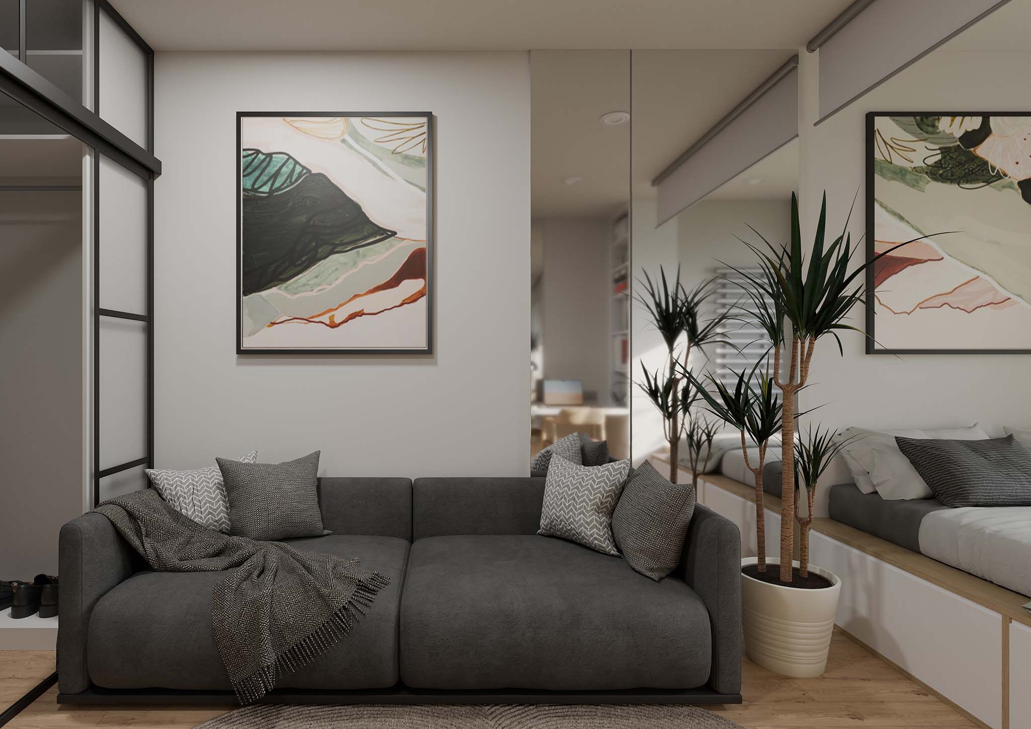 bedroom + living room + workspace + wardrobe;